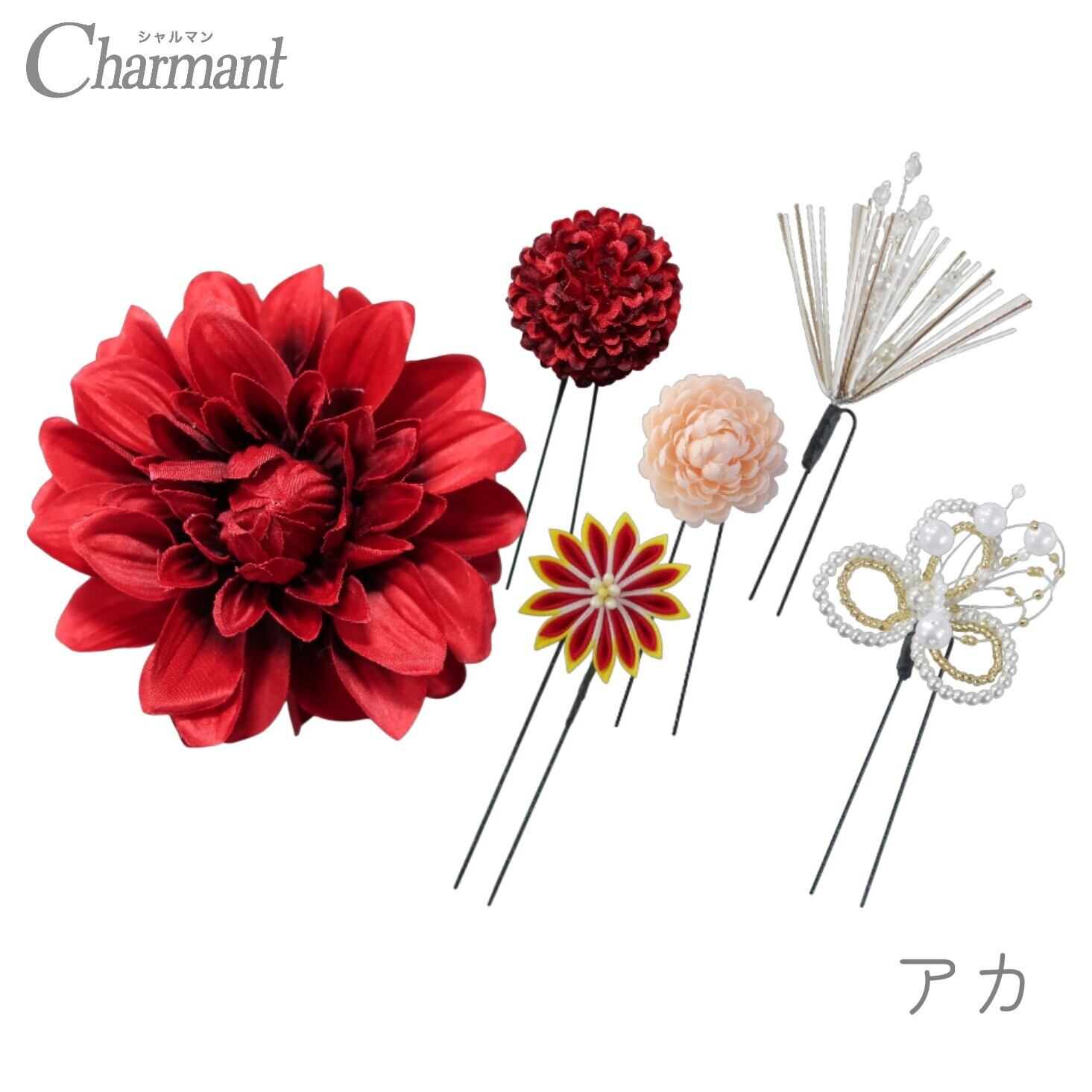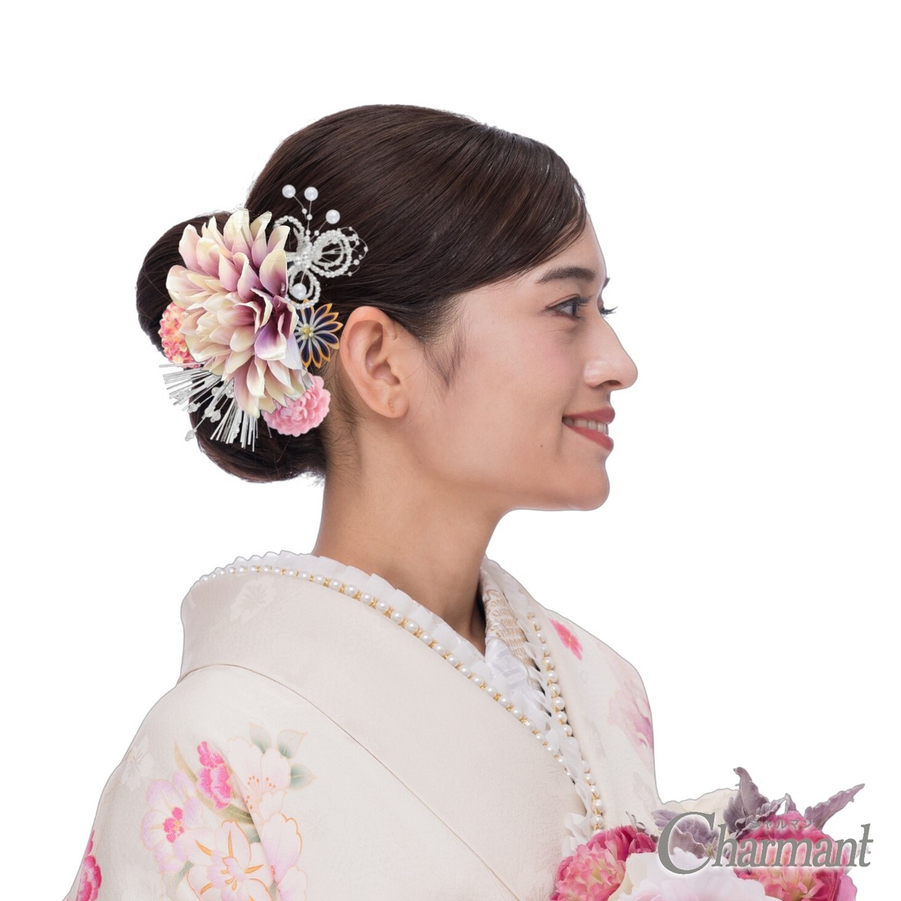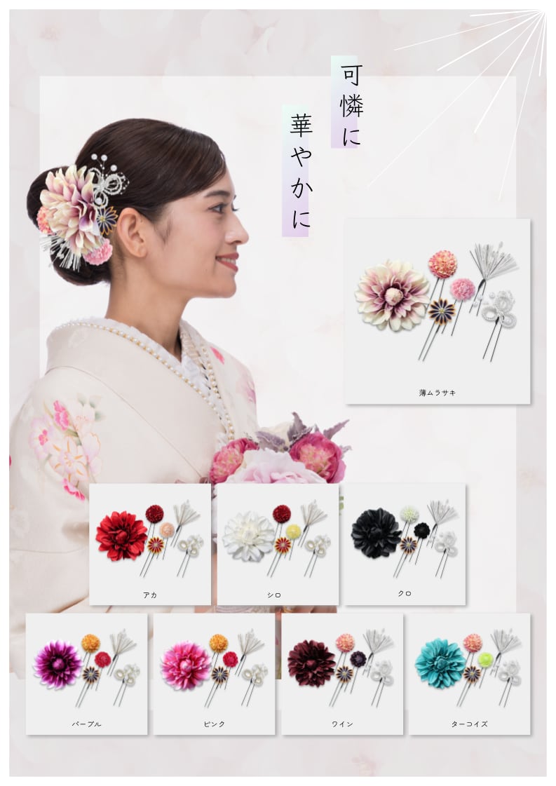 印象的なダリアのコームが目を惹く、ハレの日にぴったりの飾りです