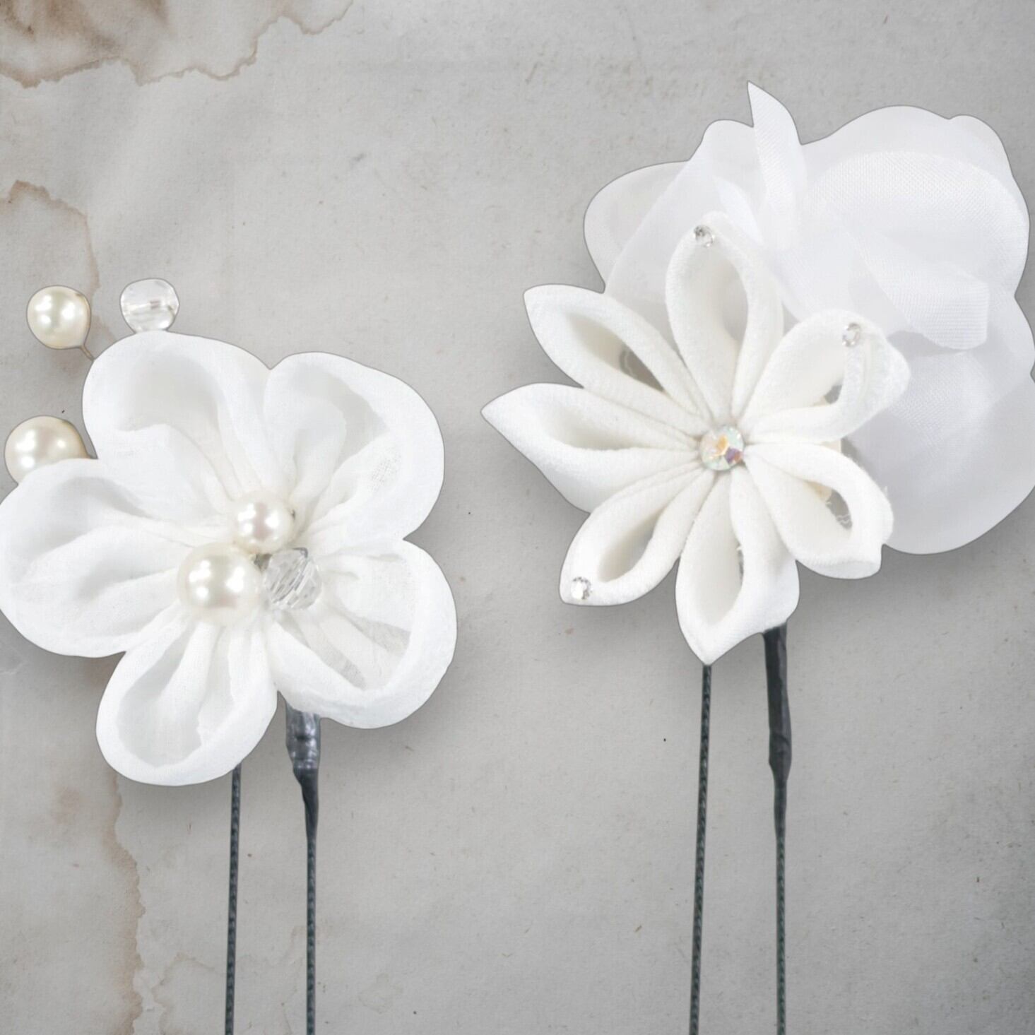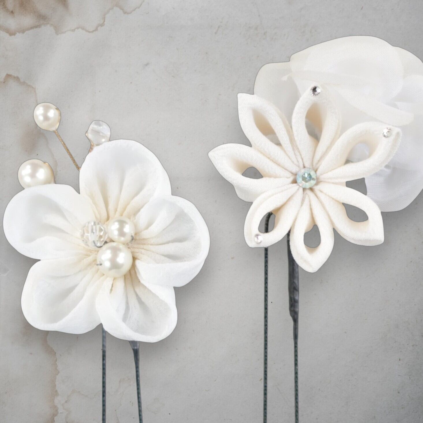 透け感が優しい、柔らかい雰囲気のつまみ細工髪飾り