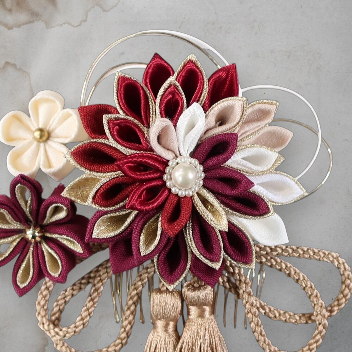 ひとつひとつ丁寧に仕立てたつまみ細工の花びらが、