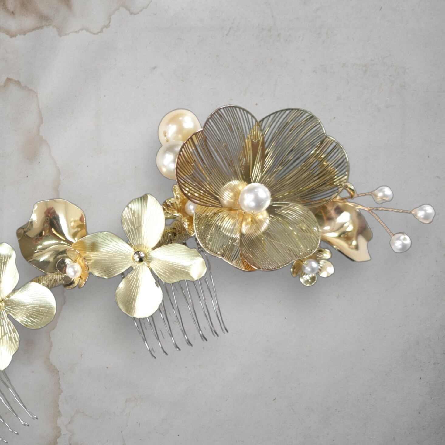 ゴールドメタルの輝きが、特別な日のヘアスタイルを上品に引き立てます